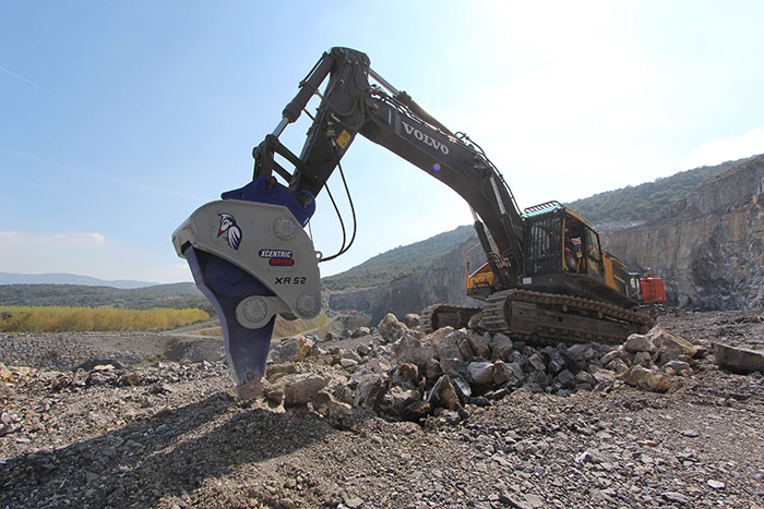 Xcentric Ripper’s working principle adopts forced eccentric run. It is all supported with two pairs of conical bearings capable of withstanding very high dynamic loads. The drive is realized with a hydraulic motor. Vibration frequency of 1000-1500 cycles per minute makes the material is loosened much more efficiently than using a hydraulic boom. Model range covers units weighing from 900 kg to 9, 5 tons. Simple construction of the machine and replaceable claws significantly reduce the cost of loosening 1 ton of rock material.